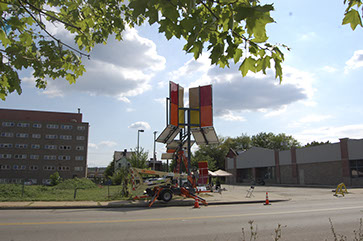 The street facing aesthetic color panels being placed. The campers chose a vibrant palette to work with their concept of a portal of hope for the community of Homewood.